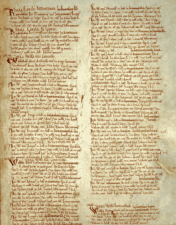 Des inspecteurs royaux parcoururent l’Angleterre en interrogeant seigneurs, paysans, prêtres et jurys locaux. Ils consignèrent minutieusement :