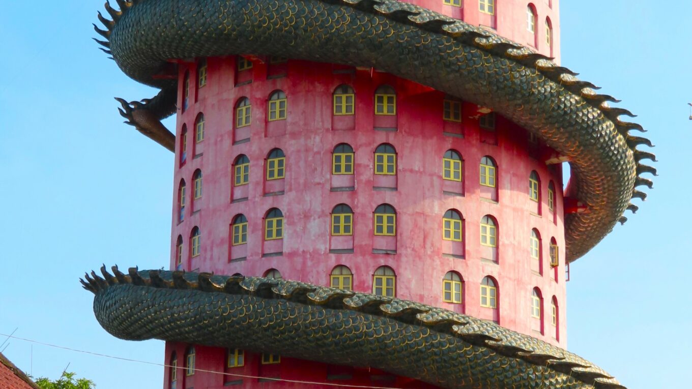 À une quarantaine de kilomètres à l’ouest de Bangkok, dans la province de Nakhon Pathom, se dresse une vision presque irréelle : une tour rose gigantesque autour de laquelle s’enroule un dragon vert colossal.